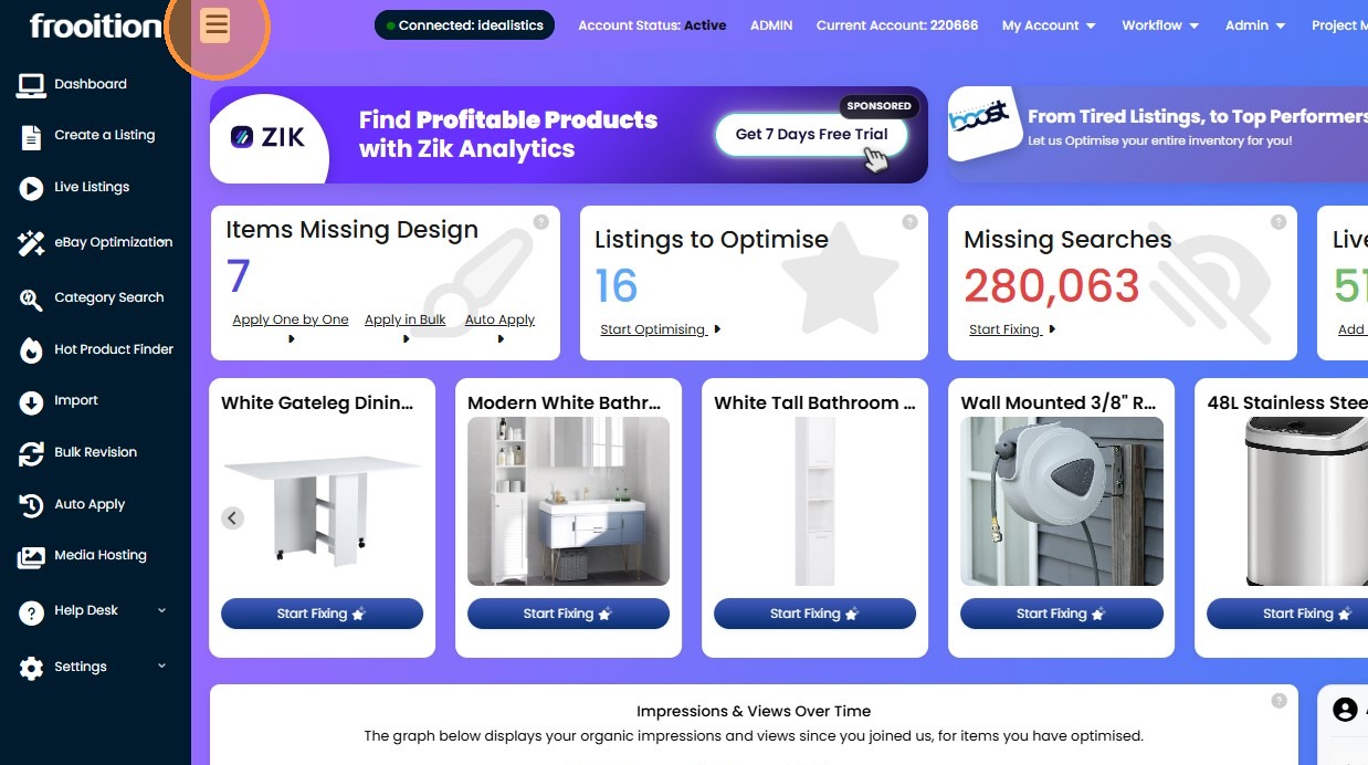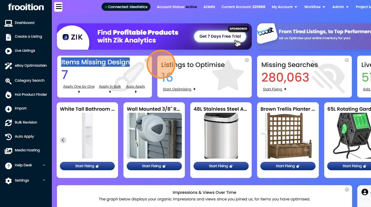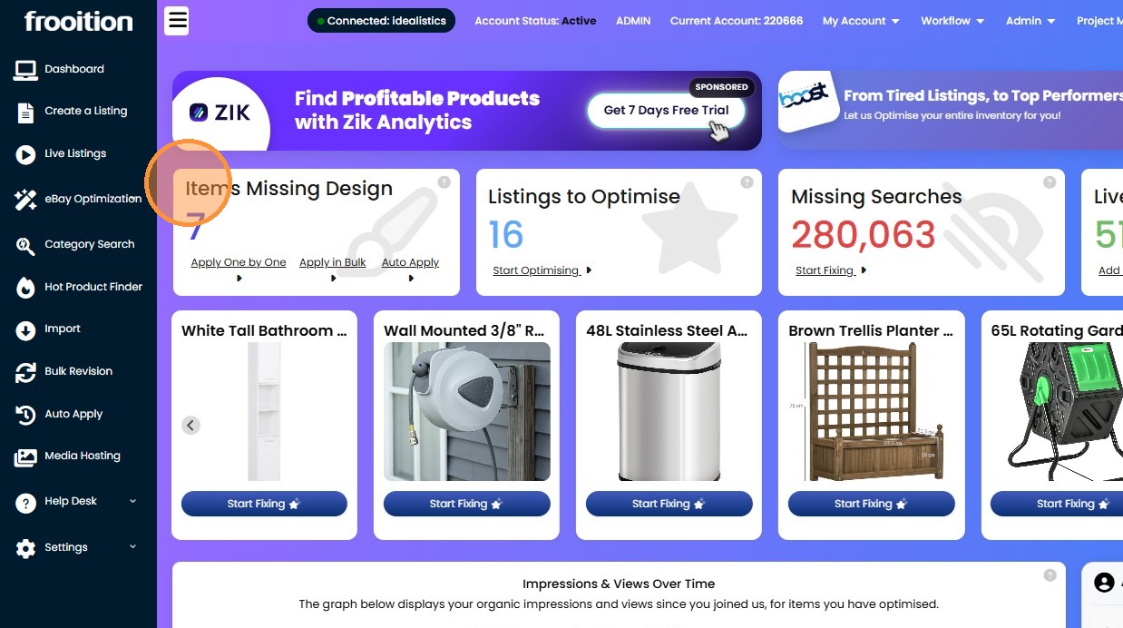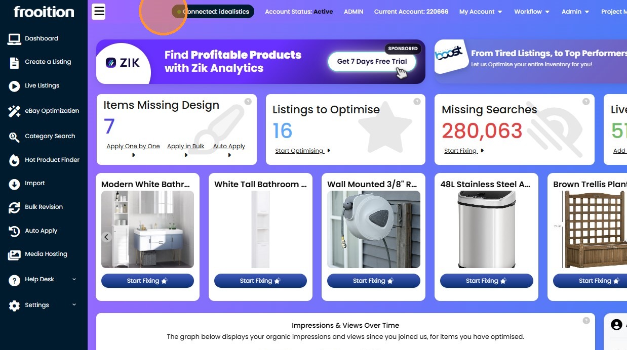 Your Frooition dashboard is the central hub for managing your eBay selling workflow — giving you real-time insight into live listings, optimization needs, missing designs, impressions and views, account details and key performance indicators. This guide explains how to use your Frooition dashboard, navigate the main features, interpret the metrics and access powerful tools that help you refine eBay listings, fix template issues and boost visibility and conversions. Whether you’re checking connection status, tracking listing performance or launching optimisation tools, understanding your dashboard helps you work faster and sell more effectively on eBay.