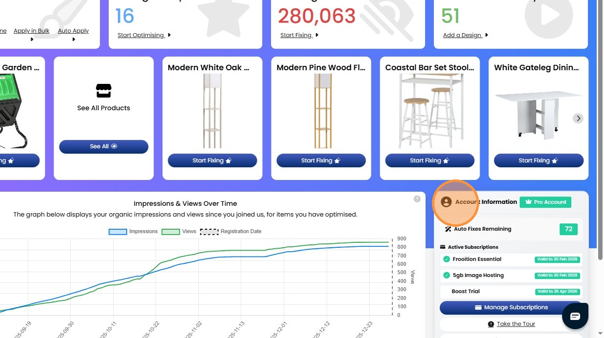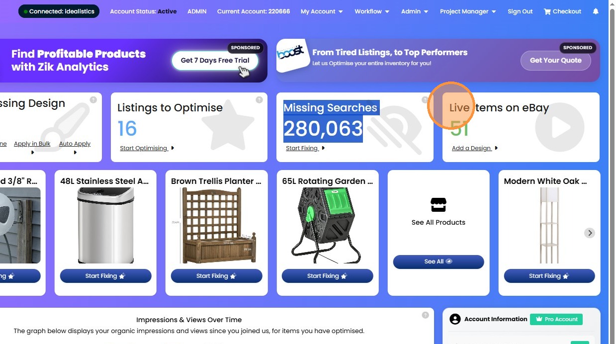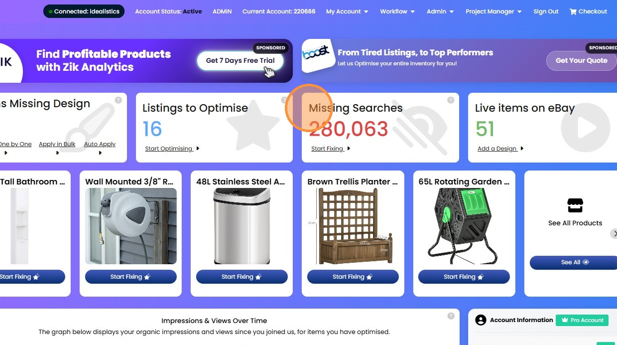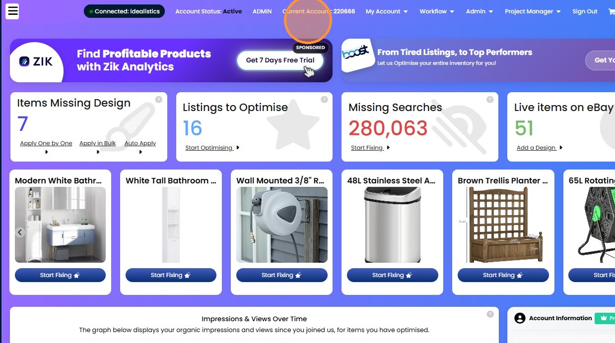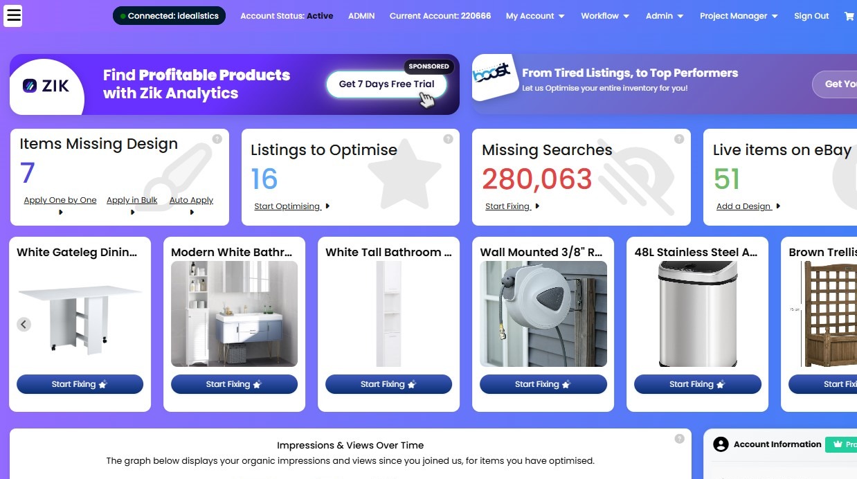Your Frooition dashboard is the central hub for managing your eBay selling workflow — giving you real-time insight into live listings, optimization needs, missing designs, impressions and views, account details and key performance indicators. This guide explains how to use your Frooition dashboard, navigate the main features, interpret the metrics and access powerful tools that help you refine eBay listings, fix template issues and boost visibility and conversions. Whether you’re checking connection status, tracking listing performance or launching optimisation tools, understanding your dashboard helps you work faster and sell more effectively on eBay.